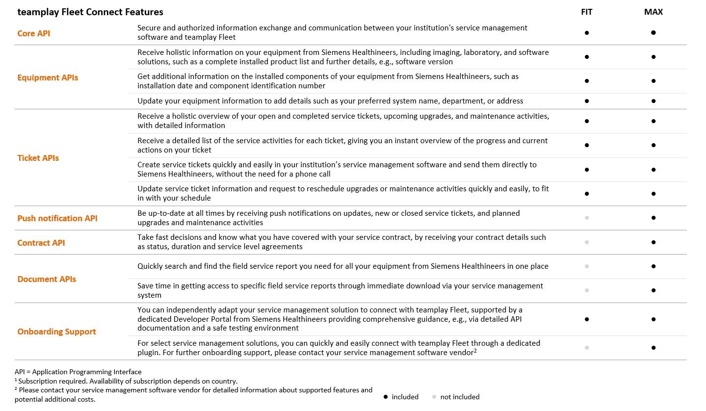 teamplay Fleet Connect enables you to connect your institution’s service management software with teamplay Fleet to exchange equipment and service information. To meet your needs, teamplay Fleet Connect is available in two bundles.