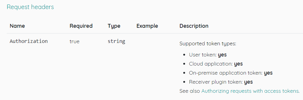 The supported token types are listed on the API details page in the Request Headers section for each API operation.