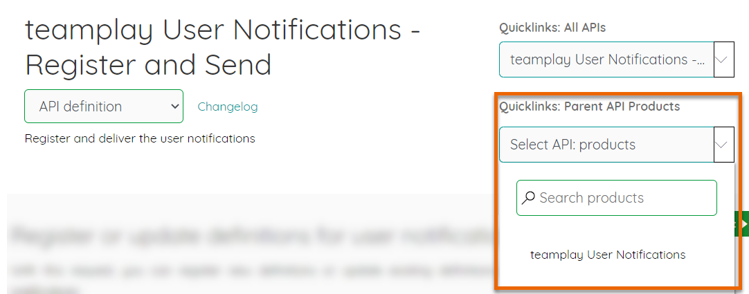 By clicking on the Quicklinks: Parent API Productsdropdown field, you can see the associated parent API products for the currently displayed API version in the dropdown menu below.