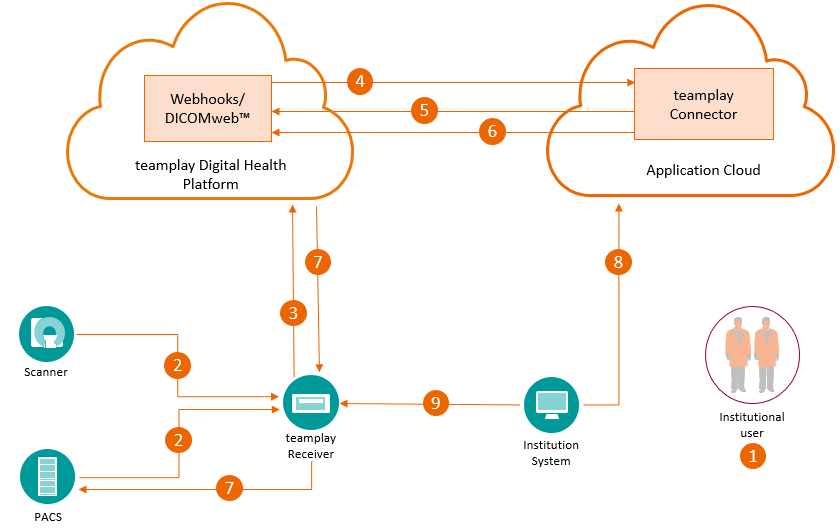 For a seamless integration with our teamplay imaging platform, we follow a standardized clinical data flow that is depicted in the graphic below in form of a teamplay DICOM image round trip.